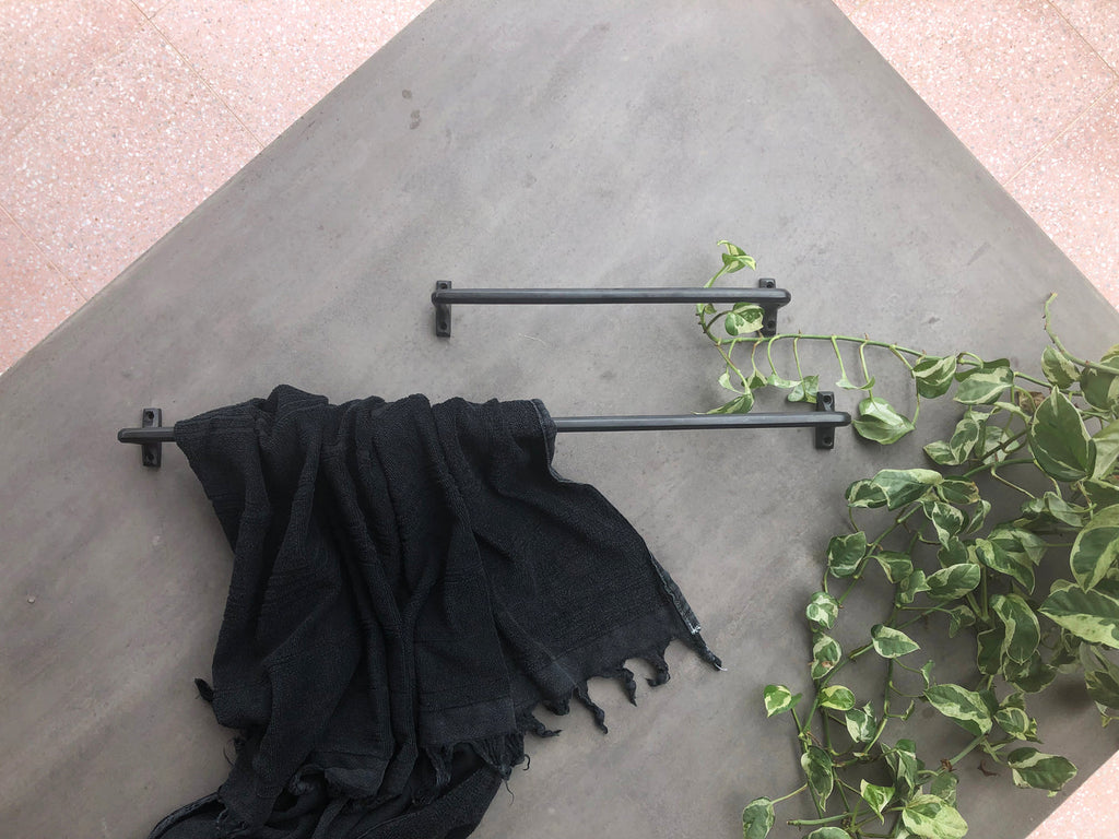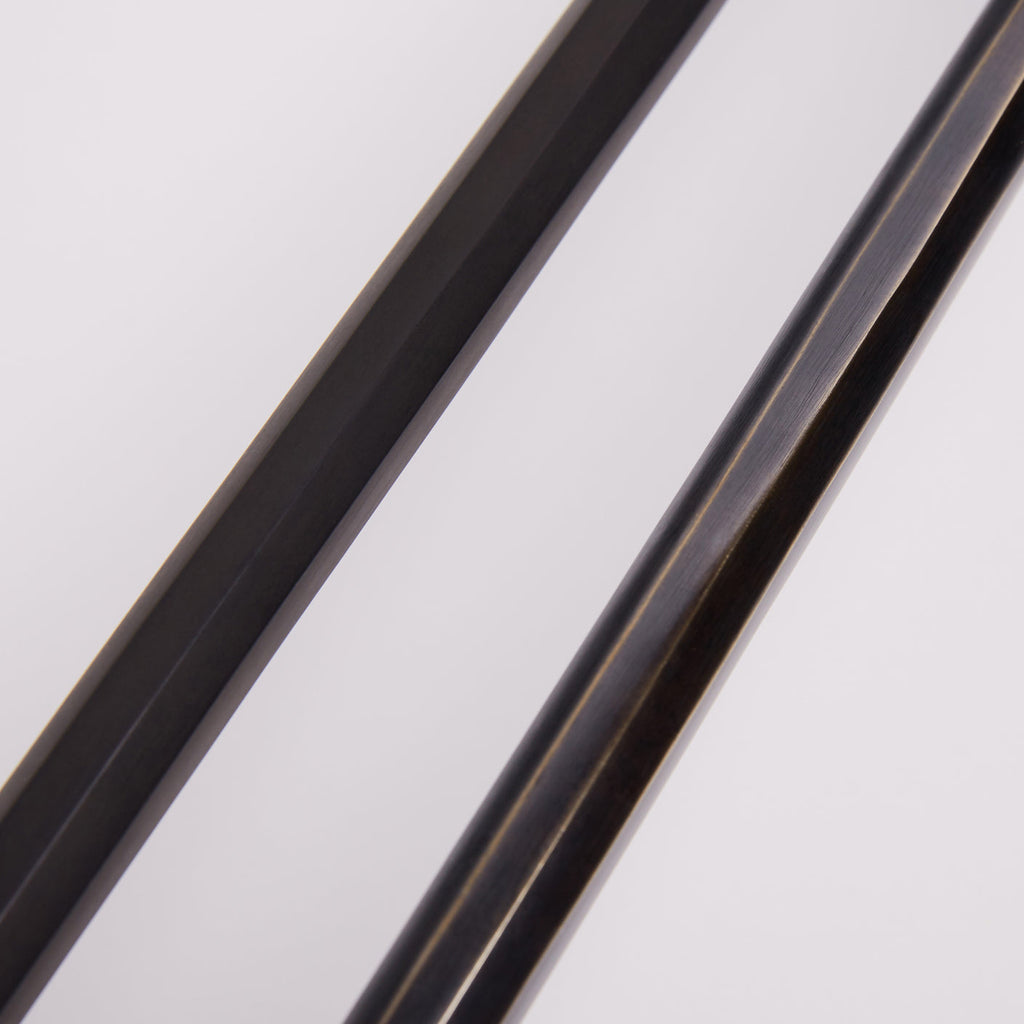 Moulded from a single piece of brass, the hexagon shape of the 300mm rail gives a subtle interest without being over bearing, while the scorched black finish is designed to patina over time with the brass undertones coming through. (Refer to images 4 & 5)